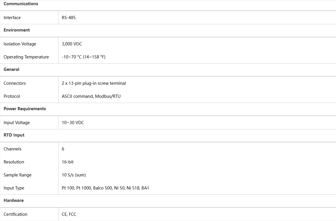 The 6-channel RTD input module is a high-precision, multi-channel intelligent acquisition module designed specifically for industrial temperature measurement and process control. This module supports 2-wire or 3-wire RTD input and is compatible with various sensor types, including Pt100, Pt1000, Balco500, and Ni series. Each channel can be independently configured with its input type and range. Built-in 3000 VDC/AC opto-isolation and circuit fuse detection ensure stable and reliable system operation. The module supports Modbus/RTU communication protocols, facilitating integration with various PLCs, HMIs, and host computer systems.