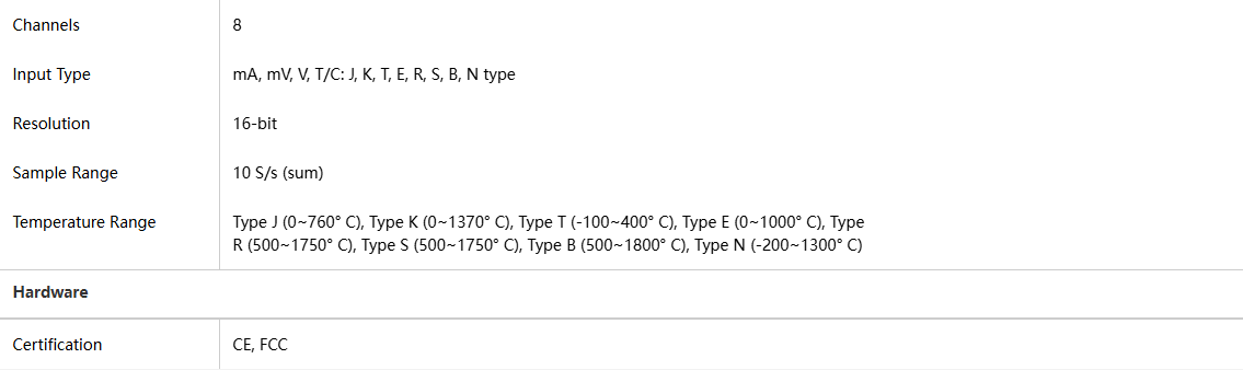 Each channel can be independently configured as mV, V, mA, or thermocouple input, enabling true multi-functional data acquisition.