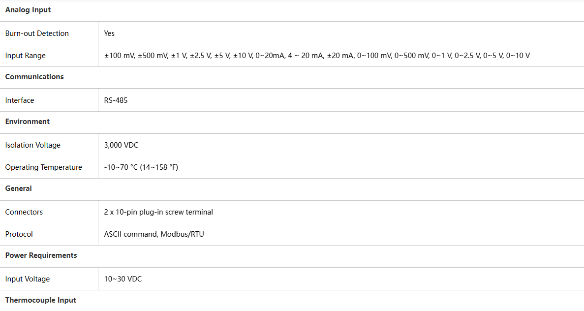 The 8-channel universal analog input module is a high-performance, high-isolation, multi-functional signal acquisition device that simultaneously supports multiple analog signal types, including voltage (V), current (mA), millivolts (mV), and thermocouples (T/C). The module features 16-bit high-resolution A/D conversion, 3000 VDC isolation protection, open-circuit detection, and supports Modbus/RTU communication protocols. It can be widely used in industrial automation, process control, and environmental monitoring systems.