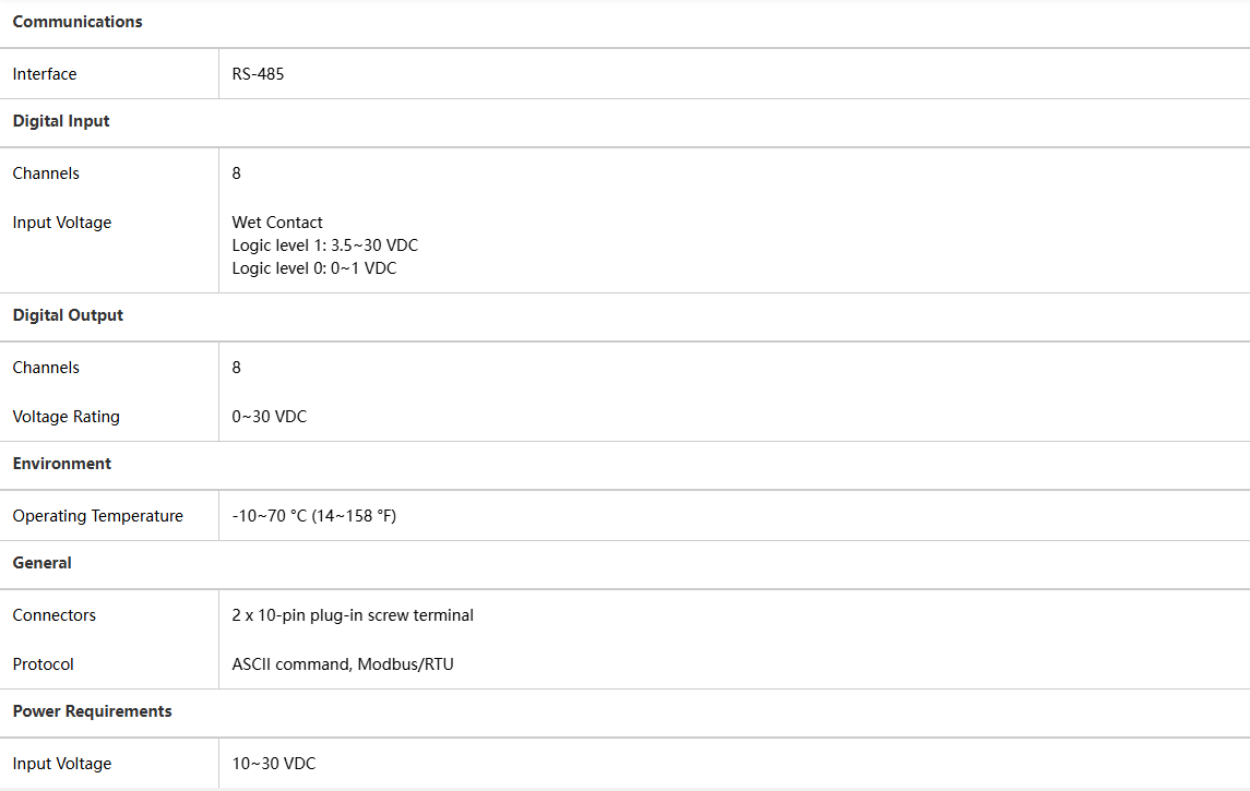 The digital I/O module is a highly stable, compact industrial input/output device, providing 7 digital input (DI) channels and 8 digital output (DO) channels, suitable for various industrial automation and remote control applications. The module has a built-in watchdog timer that automatically resets or performs safety actions in the event of communication interruption or system malfunction, ensuring stable and reliable system operation.