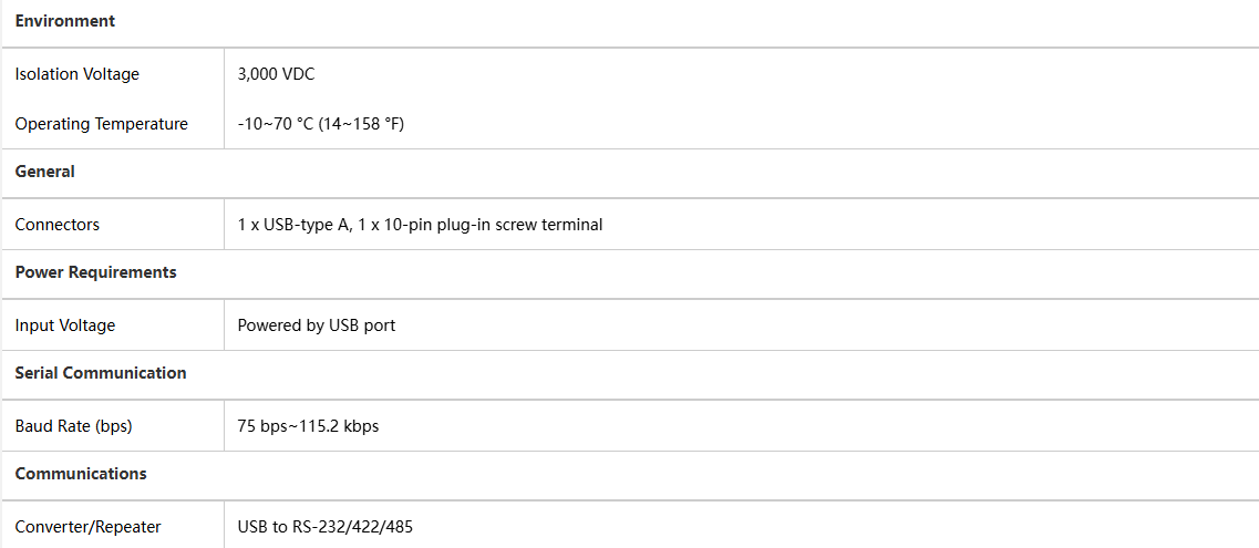 This 1-port isolated USB to RS-232/422/485 converter is a highly reliable industrial-grade communication interface conversion device used to establish a stable data connection between a USB interface and serial devices.This module fully complies with the USB 1.1 specification and supports multiple serial port standards (RS-232, RS-422, RS-485), with a maximum transmission rate of 115.2 Kbps. It features built-in 3000 VDC opto-isolation protection and RS-485 automatic data flow control to ensure the security and stability of data transmission. Requiring no external power supply, it supports plug-and-play and hot-swapping, making it ideal for industrial automation, instrument control, and communication interface expansion applications.