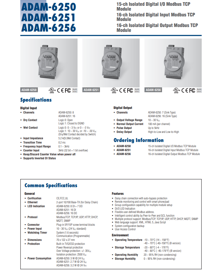 This 16-channel isolated digital input module is a high-performance intelligent I/O device based on the Modbus TCP communication protocol, designed specifically for industrial automation, remote monitoring, and IoT systems. The module uses dual RJ-45 Ethernet interfaces, supports daisy-chain network topology and automatic bypass protection, ensuring stable system communication while simplifying field wiring. Through the built-in web server, users can easily perform remote monitoring, configuration, and management using smartphones, tablets, or PC browsers. The module also supports GCL intelligent logic control and point-to-point communication, enabling localized intelligent control and independent operation without the need for an additional PLC.